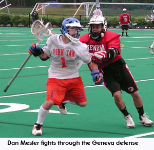 Geneva scored the first goal at 7:51 as Carson Poole picked up a loose ball near the crease and scored an unassisted goal. Penn Yan scored the next two goals as senior middie, Brendan Hamm (3g) scored (unassisted) and junior middie, John Van Houten (3g) added a goal assisted by sophomore middie, Dan Mesler (3g-1a). The quarter ended with Penn Yan up 2-1.