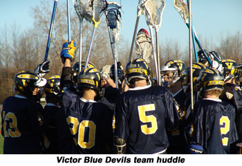 Senior attackmen Cory Benulis (3g-2a) and Mike O'Hare (3g-2a) led the offense. Sophomore attackman Jason Houtenbrink scored 2g-2a, senior middie Kyle Sullivan scored 1g-2a and junior middie Erick Rogemoser scored 2g while Jon Hankin and Eric Willman each scored one goal for Victor. Senior goalie Matt Schmelzlen had 11 saves for the Blue Devils (6-4).