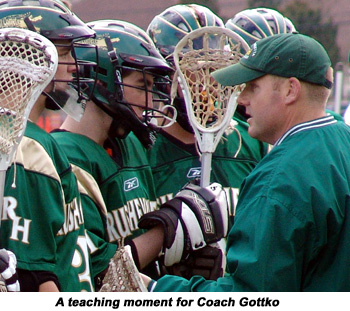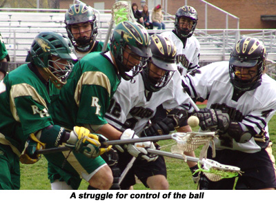 scoreboard at 8:42 when Hanna scored again (unassisted) and in man up. Senior midfielder Kevin Dacey scored an unassisted goal for the Knights less than a minute later. At 2:58 Rubino scored an unassisted goal to take the Knights within one, but after a few trips up and down the field, R-H scored the final goal of the game (junior middie Tim Barth unassisted) with 0:04 left.