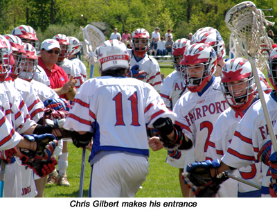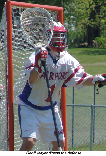 Fairport's Ryan Lowe scored first on an assist from Mike Danylyshyn at 11:02 and although Pittsford came back at 3:45 with a goal by Mike Peacock (from Justin Rand), it would be the only time the teams were tied, as the Red Raiders took a 3-1 first quarter to an 8_2 half and at 12-4 final at Fairport. Fairport's third goal was scored at 2:38 by Anthony DiMarsico (unassisted) and the last goal of the quarter was scored by Fairport's Jeff Sanna. The quarter ended with Fairport up