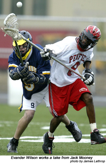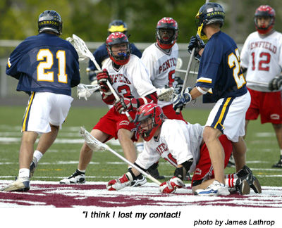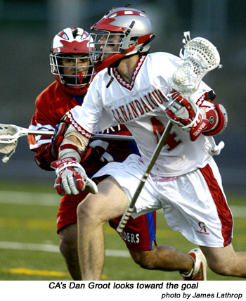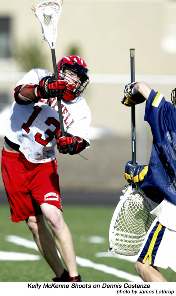 Although Schroeder scored the first goal of the game, it was Penfield dominating the first half with a 5-1 first quarter and 11-3 half before winning 15-9 in the Class A semi final game at Aquinas. Senior midfielder Mike Thon was nearly unstoppable as he scored seven goals and assisted on two others. Junior goalie Brian Dell made 14 saves, a number of which were one-on-ones from short range.