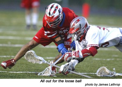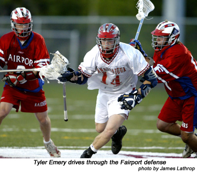 The Red Raiders scored the first three goals of the game and held the powerful Braves scoreless in the first quarter and nearly halfway through the second. Once the Braves started their offense they became difficult to contain and after scoring the tying goal just before the half, outscored Fairport 5-1 in the second half for the win.