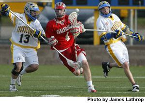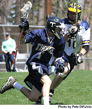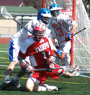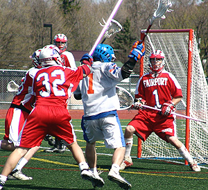 Like the Schroeder-Penn Yan game last week, the game was a lesson in the power of defense as both Fairport and Penn Yan defensive units limited shooting opportunities and each goalie made big "high pressure" saves when needed. The tied scored remained until the last minute of the third quarter. Fairport's Mike Danylyshyn scored a man up goal with an assist from Shawn Runyon at 0:54. The Red Raider lead didn't last long as Mike Manley won the faceoff and ran down field making an incredibly hard side arm shot with his defensive stick and scoring with 0:48 left in the quarter. At the end of the third quarter Penn Yan was up 4-3.
