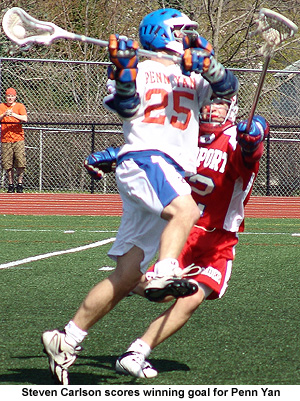 Junior midfielder Steven Carlson scored three goals including one with just 0:45 in the game to give Penn Yan the 6-5 win over visiting Fairport in this great game that featured incredible defense and dramatic goals by both teams.