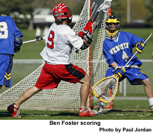 After checking each other out a number of times, Penfield scored first when Kelly McKenna hit the nets on an inside feed from Dave Malone at 8:31. Less than one minute later, Chris Ferry scored (unassisted) for Schroeder. At 4:24, Jay Willmes scored for the Warriors on a pass from Eric Chavoustie to give Webster the lead, but only for a couple of minutes as the Patriots came back with three quick goals before the end of the quarter. Kevin Green scored first (unassisted) at 2:11. Twenty-four seconds later Mike Arvan scored after dodging his defender and scoring on a stick high, corner shot. Nineteen seconds later Ben Foster scored an unassisted goal for Penfield who ended the quarter up 4-2.