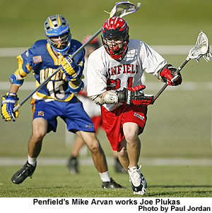 In goal, Penfield's Brian Dell had 5 saves and Irondequoit's Zach Nash had 14. McKenna won 10 out of 13 face offs and Cummins 3 out of 6. Alex Nowak(7 ground balls), Kevin Randall, and Joe Clay led a strong defensive effort for the Patriots (11-1). No report from Irondequoit.
