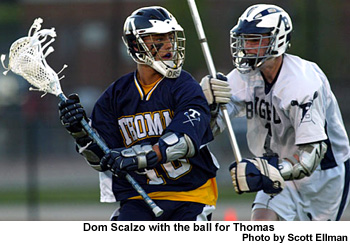 The second quarter was similar with Kemp scoring on an assist from Scalzo, a goal from Rothfuss (assisted by Gurowski) in man up, DetWiller (unassisted) and then Scalzo with an assist from Hinderland. Brighton's Colin Hickey scored the next goal with a dodge from behind the cage. The next Thomas goal was from Kyle Lavallee assisted by Hinderlind. At the end of half Thomas was up 11-3.