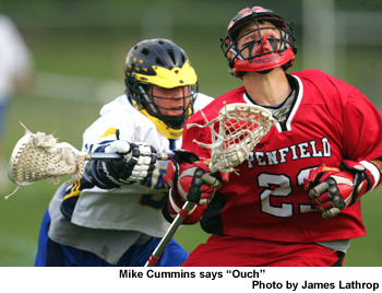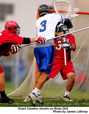 The Warriors tied the game again at the top of the fourth quarter as Tota took the ball from Winslow at 11:05 on a cross cage feed and a shot high off stick. Mike Cummins scored for Penfield at 9:44 on a feed from Dave Malone from behind the cage. McKenna won the next two face offs in a row, producing scores by Malone (assisted by Ben Foster) at 9:34 and by Malone on an assist from McKenna at 9:05 and giving the Patriots a 10-7 lead. The pressure remained however, as Schroeder came back at 5:44 with a goal by Austin Orsini, assisted by Tota on a run straight from the Warrior clear. Penfield took back the three goal lead when they scored their last goal of the game when Malone scored on an assist from Rice in man up. Catalino added one more for Schroeder at 1:07 on an unassisted drive from the side of the goal.