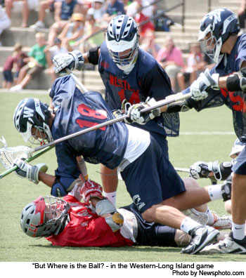 Pierotti, who led all teams in assists after day one, scored his first goal (assisted by Mitch Keefer) during an extra-man opportunity. Savage scored one goal for Long Island and Jeff Tundo scored his first of the tournament for Western.