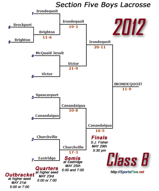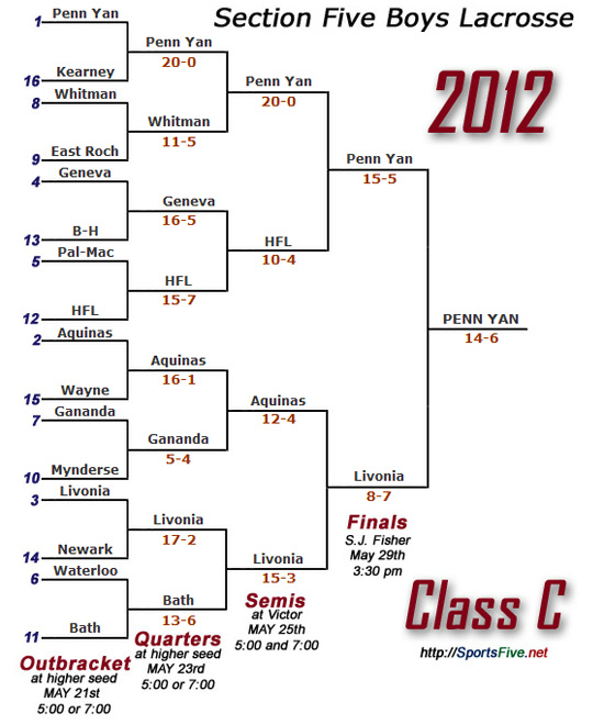 The top three seeds once again won Section V Championships this year with Fairport's 16-10 win over #2, Penfield, Irondequoit's 11-9 win over #6, Canandaigua and Penn Yan's 14-6 win over #3 Livonia. Fairport capped a phenomenal undefeated regular season, the only undefeated team in the Section this year. It was their seventh sectional championship with the most recent in 2010. The Eagles, on the other hand, returned for their third championship in a row. Penn Yan returned for their 17th championship.
