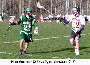 get in control of their home contest against Rush-Henrietta and to win 9-3. The Titans took a 2-0 lead in the first quarter with two goals by senior middie, Steve Hutton. R-H scored the only goal in the second quarter when senior attackman, Tyler Allen scored on a feed from senior midfielder, Joe Malach at the 6:57 mark. The half ended with Thomas up, 2-1.