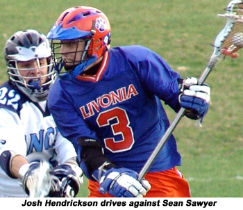 By the end of the game Livonia saw scoring as follows: Britton (2g-4a), Hendrickson (4g), Mosher (3g), Wright (2g, 2a), Dalberth (1g-1a), Simpson (1g) and sophomore attackman Brian Sciera (1a). Close defenders Shane Moran, Andy Kurtz, Jeremy Allston and Jason Levesque, kept the Lancers at bay allowing only one goal in the second half of play. Junior goalie Aaron Jamison made 15 saves for Livonia.