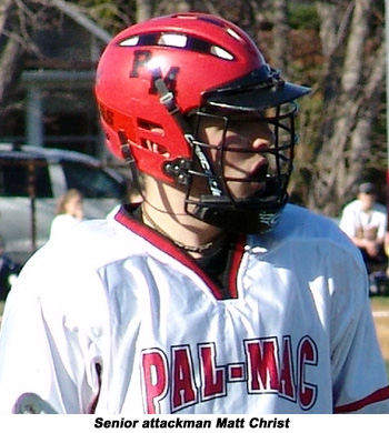 Christ finished the game with 4g-3a and Dave Bennett who dominated the face off circle finished with 4g-1a. Jaimie Sinopoli added 2g and Owen Campbell added 1a. Ben Dlugosh had 17 saves for Pal-Mac (6-8)